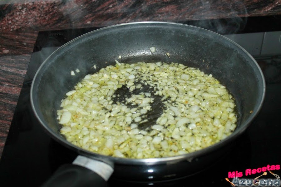 Ponemos una sartén al fuego, a fuego medio, cuando este caliente añadiremos un fondo de aceite y pondremos la cebolla a pochar, salpimentamos y la dejaremos 2 minutos para poder añadir el ajo picado.