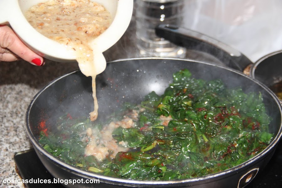 En el mismo aceite que hemos frito los ajos freímos ahora las espinacas que previamente habremos cocido. Una vez fritas añadimos el pimentón y el majado que teníamos reservado.