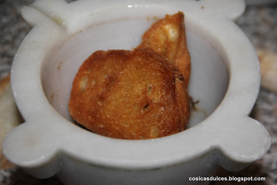 Comenzamos friendo las dos rebanadas de pan y los tres dientes de ajo. Una vez fritos los pasamos a un mortero. Añadimos la pimienta, la sal, los cominos y las hebras de azafrán. Siguiendo los consejos de Sanfiro, antes de añadir el azafrán he metido las hebras durante 15 segundos en el microondas para que soltasen todo su aroma y ha sido todo un acierto. Hacemos un majado, añadimos un vaso de agua y reservamos.