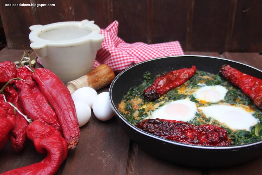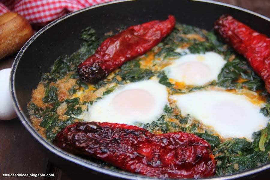 Dejamos a fuego suave y con la cazuela tapada el tiempo justo para que se cuajen los huevos y listo. A mi me gusta servirlo con unos pimientos rojos fritos.