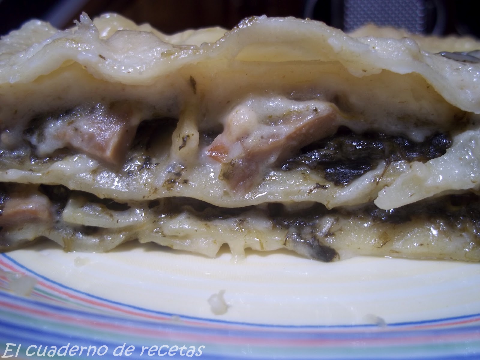 Y por hoy, termino con un plato de pasta, muy conocido, Lasaña. Pero rellena de espinacas, claro. En mi blog " El cuaderno de recetas" podéis ver cómo la hago Lasaña de espinacas y champiñones. Por cierto, perdón por las fotos, que son malas, malísimas.