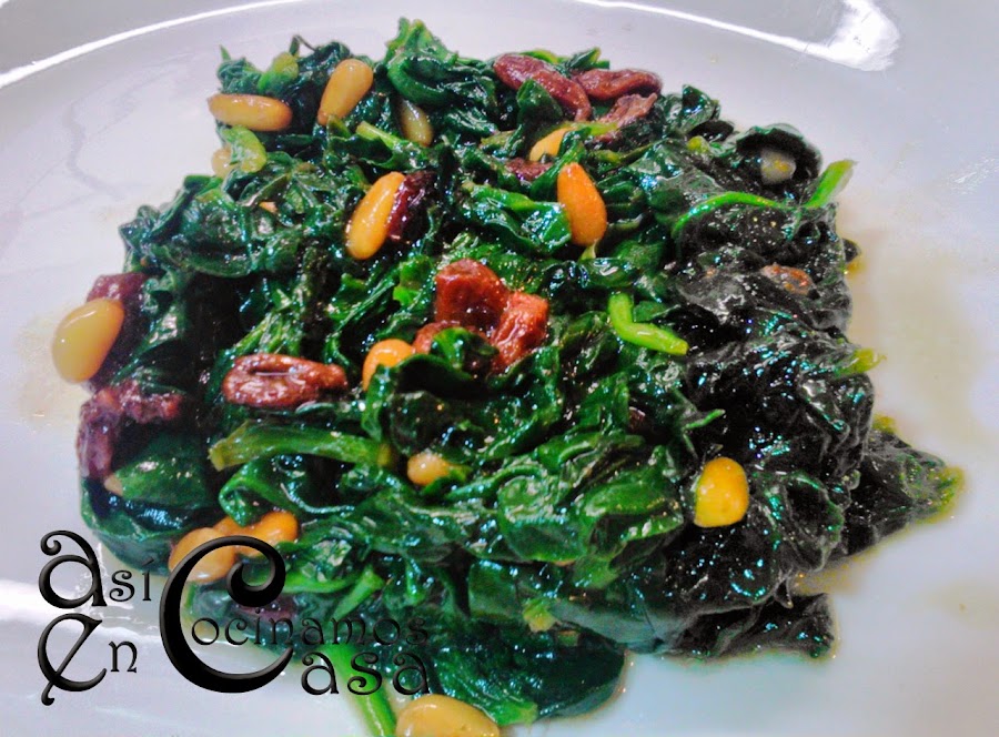 Ponemos en la sartén un puñado de uvas pasas y otro de piñones. Se irán haciendo poco a poco,estarán cuando las uvas hayan aumentado de tamaño y los piñones se hayan tostado.