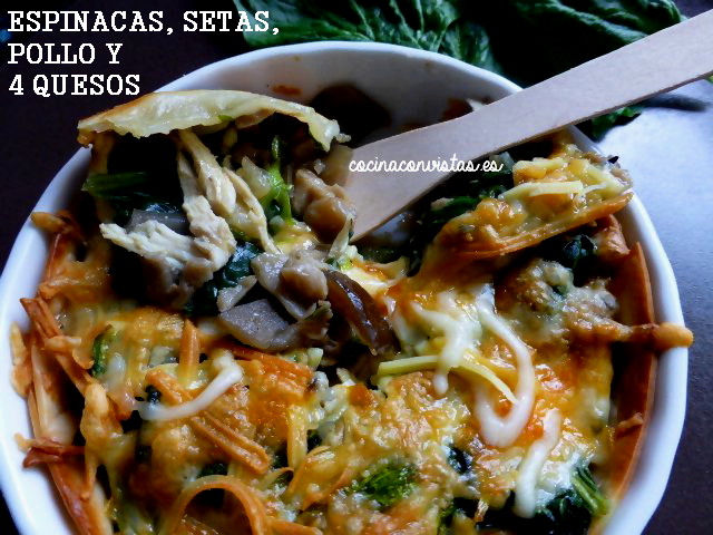 Rellenamos con las setas y el pollo y encima colocamos las espinacas.