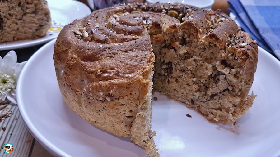 3.- Colocamos la espiral de brioche con semillas en un plato cubierto con papel de horno. Colocamos sobre el plato un molde de tartas. Dejamos que la masa repose y doble su volumen durante una horas más, esparcimos un poco de sal por encima de la masa. Precalentamos el horno a 180º, cocinamos el pan de semillas 25 0 30 minutos. Retiramos el pan del horno, dejamos que se enfría sobre una rejilla.