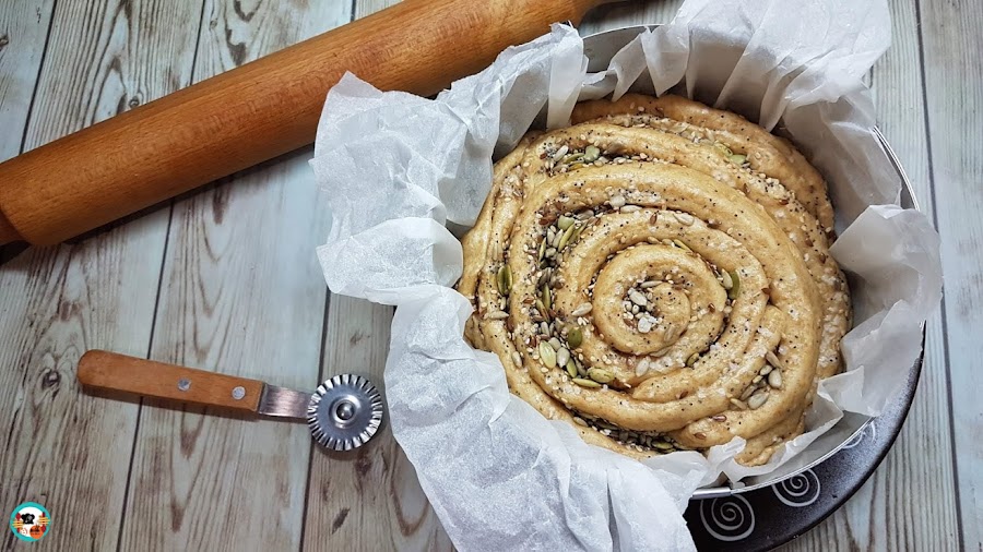 2.- Disponemos la masa en un plato grande cubierto con una gotas de aceite de oliva. Cubrimos la masa con un paño limpio, dejamos que la masa repose en un cálido y seco durante una hora. Pasado ese tiempo, estiramos la masa en una superficie limpia y cubierta con un poco de harina o papel de horno. Cortamos la masa en 6 tiras, esparcimos por encima un poco de semillas. Enrollamos las tiras ( la primera sobre si misma formando una rosa, las siguientes tiras sobre la primera que hemos formado. Así hasta terminar con todas las tiras).