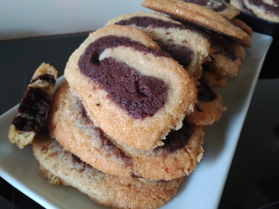 - Pasado este tiempo, estiramos primero la masa blanca, y luego ponemos la de cacao encima, también estirada.