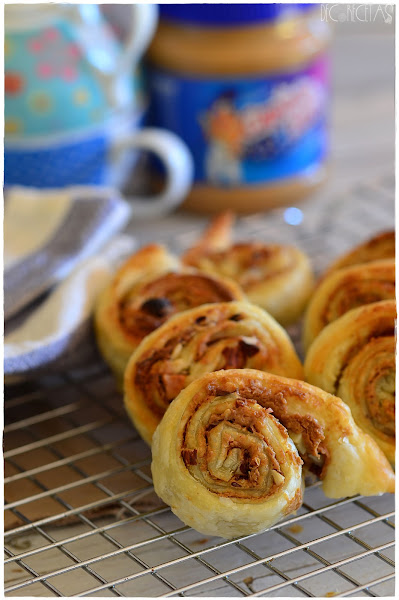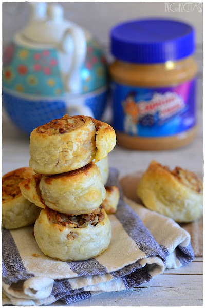 En una lámina de hojaldre, untaremos crema de cacahuete por toda su superficie a la que añadiremos frutos secos, en mi caso avellanas picadas. Enrollamos y cortamos las porciones como de un dedo de grosor, colocando las encima de una bandeja de horno, pintandolas con leche, y horneandolas con el horno precalentado a 180° por unos 15 a 20 minutos.