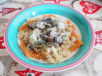 - Cuando esté todo listo, colocamos la pasta bien escurrida en un plato y sobre ella una buena cantidad del rehogado de setas y gambas. Espolvoreamos queso rallado por encima... y a comer!
