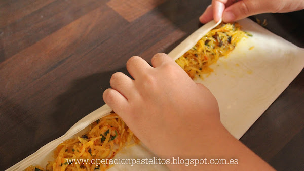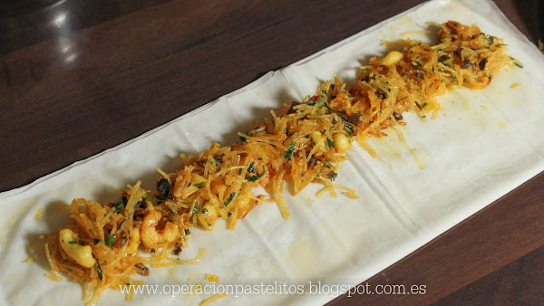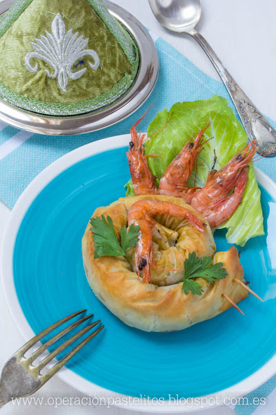Puedes utilizar tanto la pasta filo o la hoja brick, la textura cambia ligeramente pero quedan de las dos maneras muy ricas. Yo en esta receta, he optado hacerlas en tamano individual y asi servira de entrante pero puedes hacer una espiral grande y presentar tu plato como plato principal ya que acompanado de una ensalada variada constituye una comida completa.