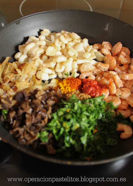 9. En una sartén,ponemos todo junto : los champiñones negros, las gambas, la cebolla, los calamares, el perejil picado, el ajo picadito y las especias al gusto: comino, curcuma, pimenton dulce, harissa o pimenton picante, sal, pimienta negra recién molida, limon confitado cortado en trocitos y removemos a fuego suave con una cucharada de aceite de oliva hasta que se integren todos los ingredientes juntos.