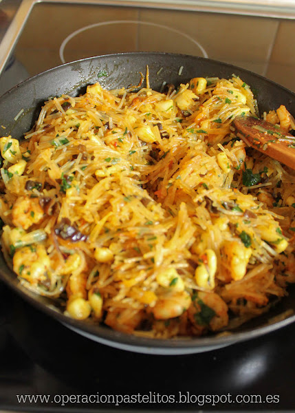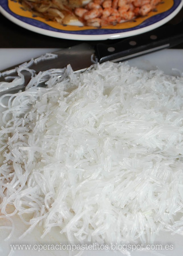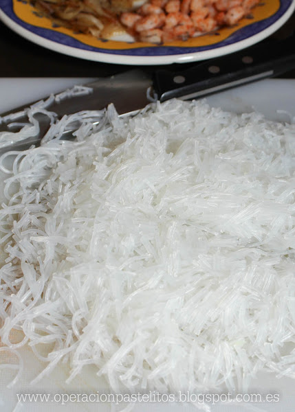6. Cuando ya estén los fideos hidratados, los escurrimos bien y luego los cortamos finitos con unas tijeras o con el cuchillo:
