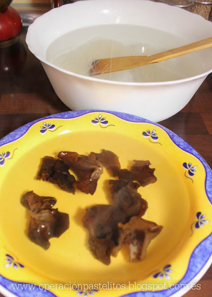 2. Hacemos lo mismo con los champiñones secos para hidratarlos. Los ponemos en un cuenco, les echamos agua hirviendo y los dejamos hidratar durante unos 10 min aprox.