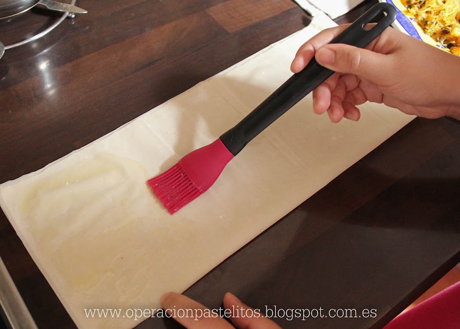 5. Cerramos con dos pallilos para que no se nos abra al hornear y pincelamos toda la superficie con mantequilla fundida: