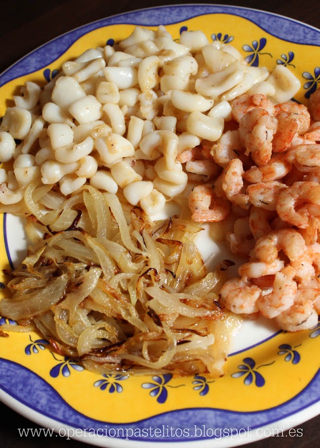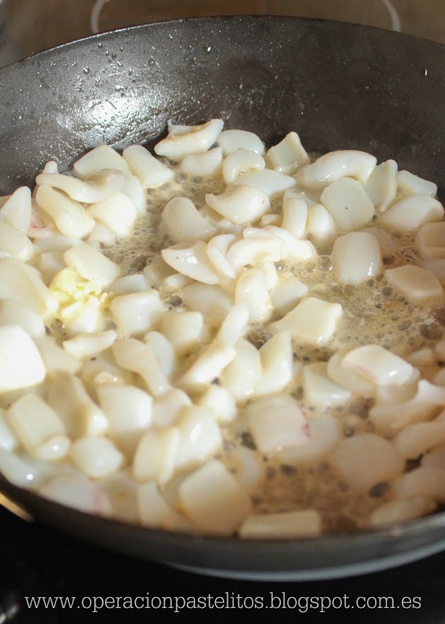 5. Ahora pasamos a los calamares: cortamos las anillas en trozos pequeños y los sofreimos en la misma sartén agregando un poco de aceite si fuera necesario. Salpimentamos y cuando estén hechas, las retiramos de la sartén y reservamos.