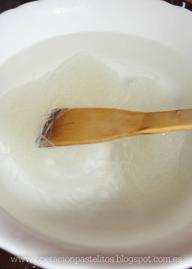 1. Primero, calentamos agua en un cazo hasta que llegue a hervir y lo echamos encima de los fideos chinos que pusimos previamente en un bol grande. Dejamos que se hidraten durante unos 10-15 min.