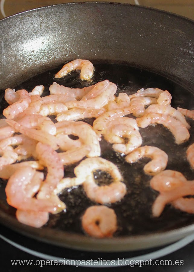 4. En la misma sartén, pasamos un poco las gambas peladas a fuego fuerte. Salpimentamos. Cuando estén ligeramente doradas, las retiramos y reservamos.