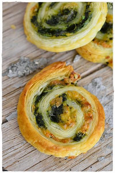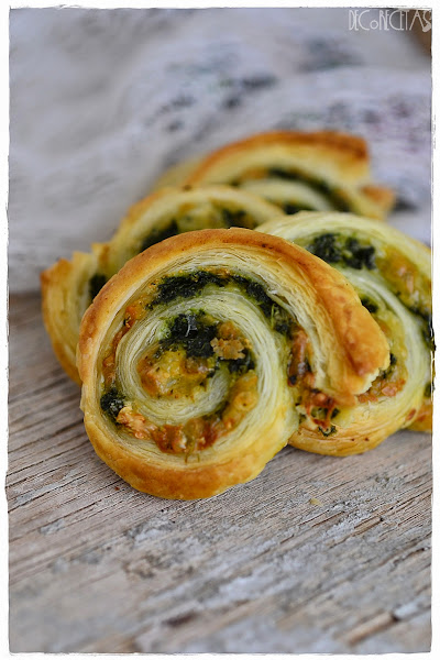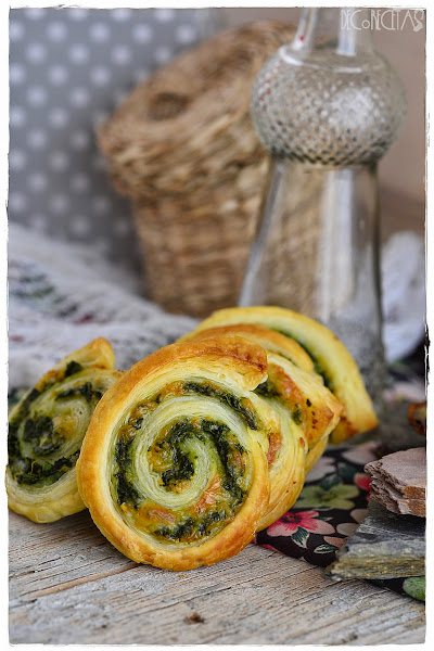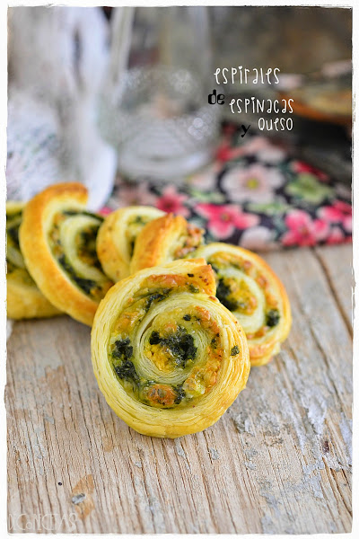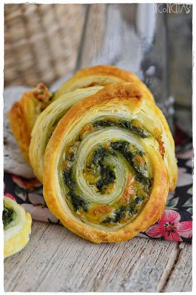 Para realizarlas, extendemos la lámina del hojaldre y pintamos con huevo batido, Sobre el huevo extendemos queso rallado y encima estas espinacas hasta cubrir toda la superficie. Enrollamos el hojaldre hasta formar un cilindro, y cortamos las porciones del grosor que queramos. Ya sólo queda meter al horno precalentado, a 180º durante unos 20 minutos.