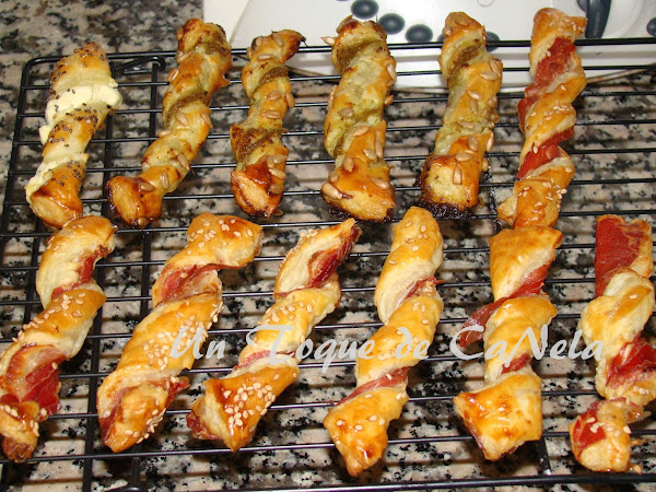 Cortar el hojaldre en tiras, poner el jamón y enrollar sobre sí mismo varias veces.