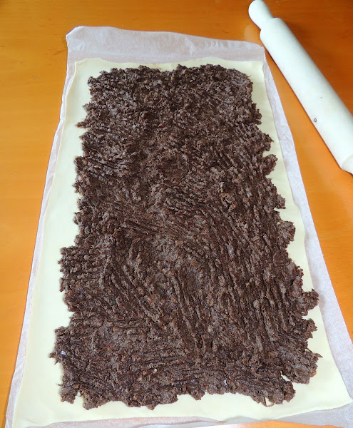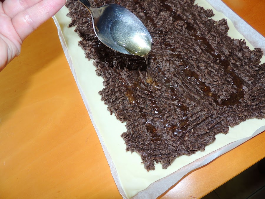 Se reparten las morcillas desmenuzadas llegando a los bordes más pequeños del rectángulo.