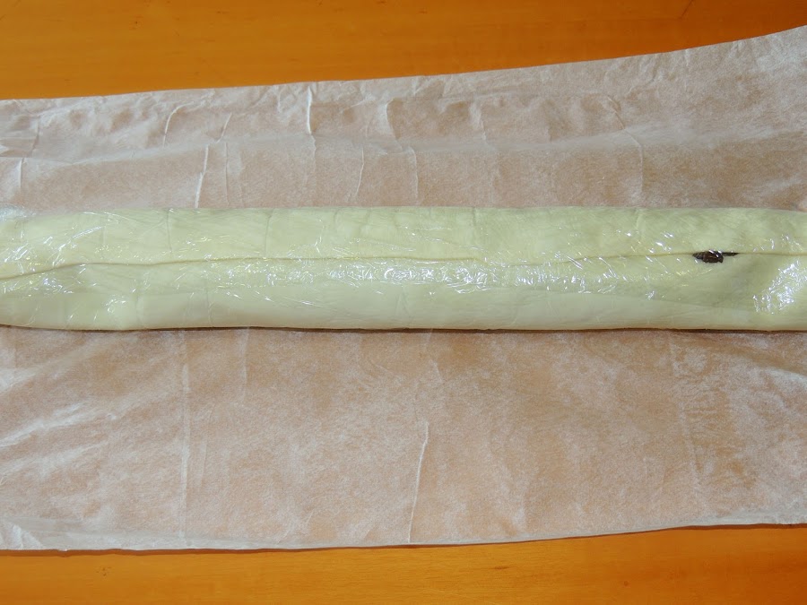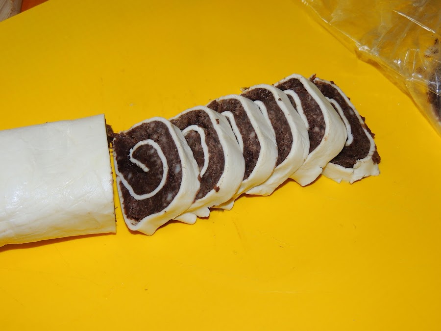 Se mete un par de horas al congelador. Este es el secreto para que salgan las espirales tan finas y no se rompan. Después se precalienta el horno a 200º se quita el film y se cortan en tiras delgadas sin ninguna dificultad.