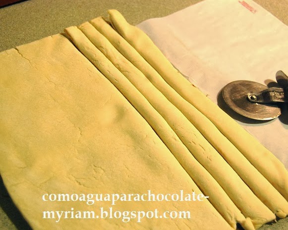 Ahora cogeremos una por una las tiras y las iremos rotorciendo y dejando en la bandeja que vayamos a hornearlas forrada de papel de horno formando las espirales.