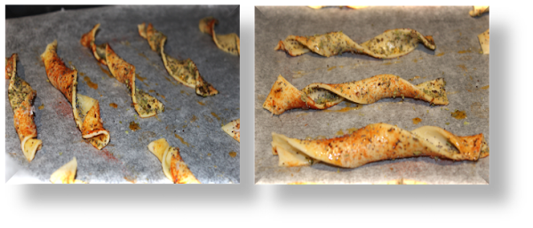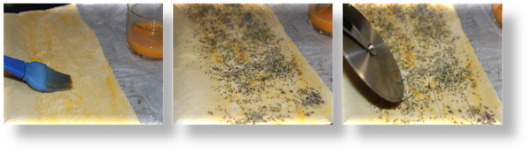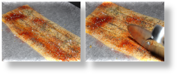 Espolvorea con orégano, semillas de chia, pimentón y unas escamas de sal (opcional). Corta por la mitad de la placa de hojaldre. Saldrán 10 espirales.