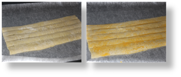 Vuelca el hojaldre sobre una hoja de papel vegetal y pincela con huevo batido la otra parte de hojaldre.