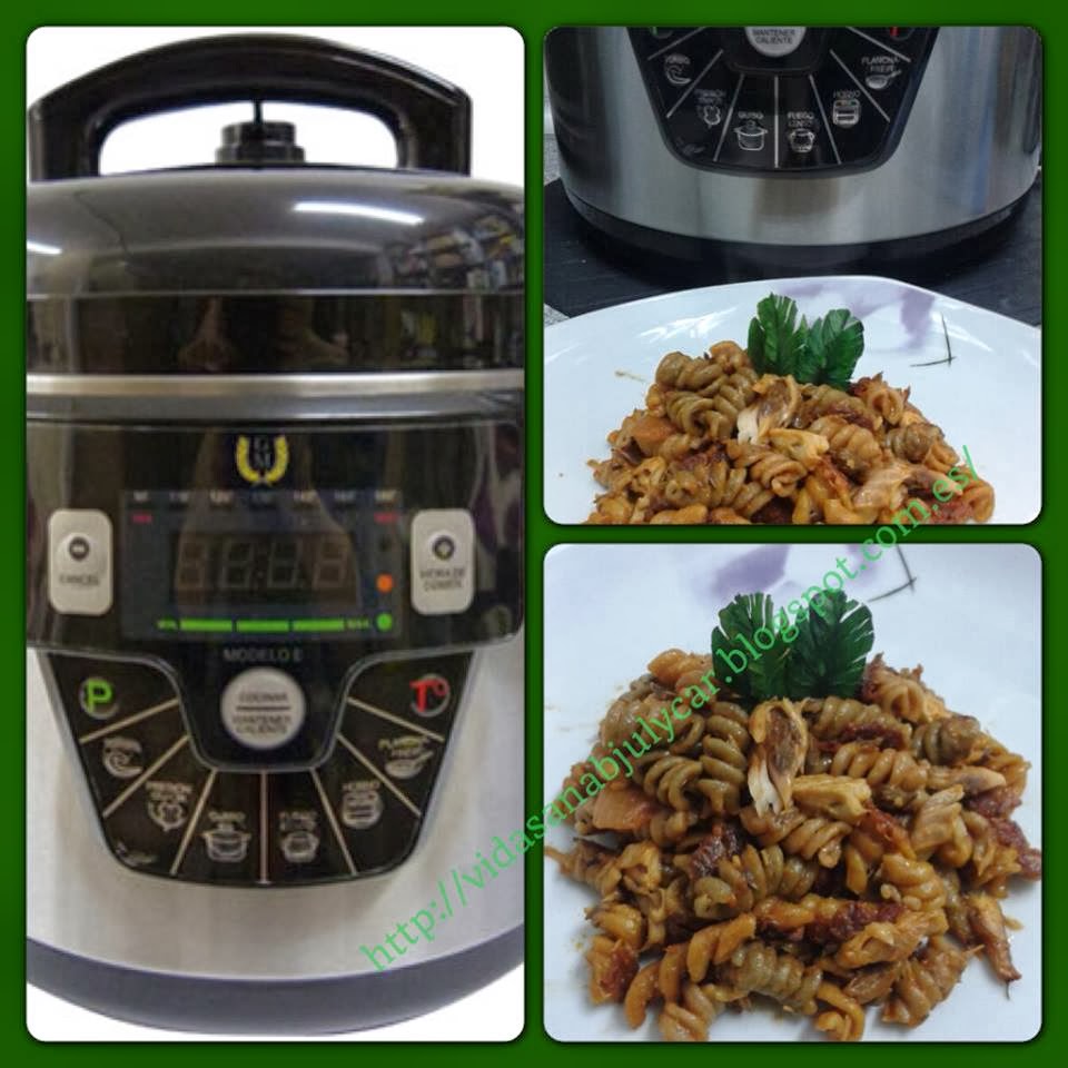 Poner todos los ingredientes en la cubeta de la GM E, cubrir al ras de agua la pasta, tapar con válvula cerrada, menú presión vapor, 130º, 5 minutos, cuando termine despresurizar manualmente y servir