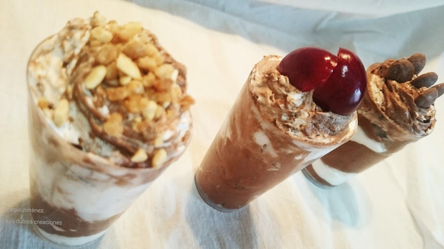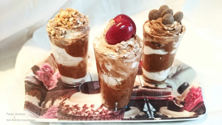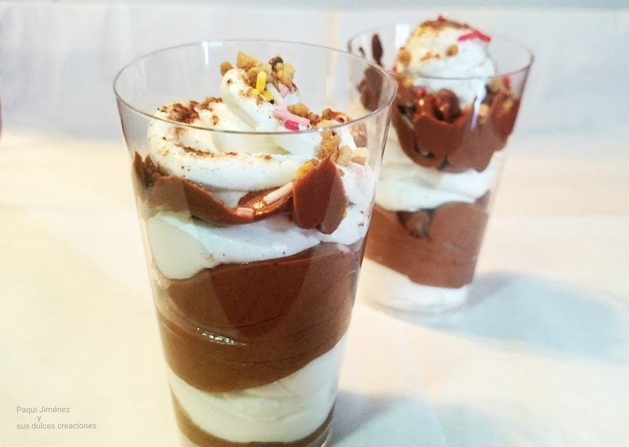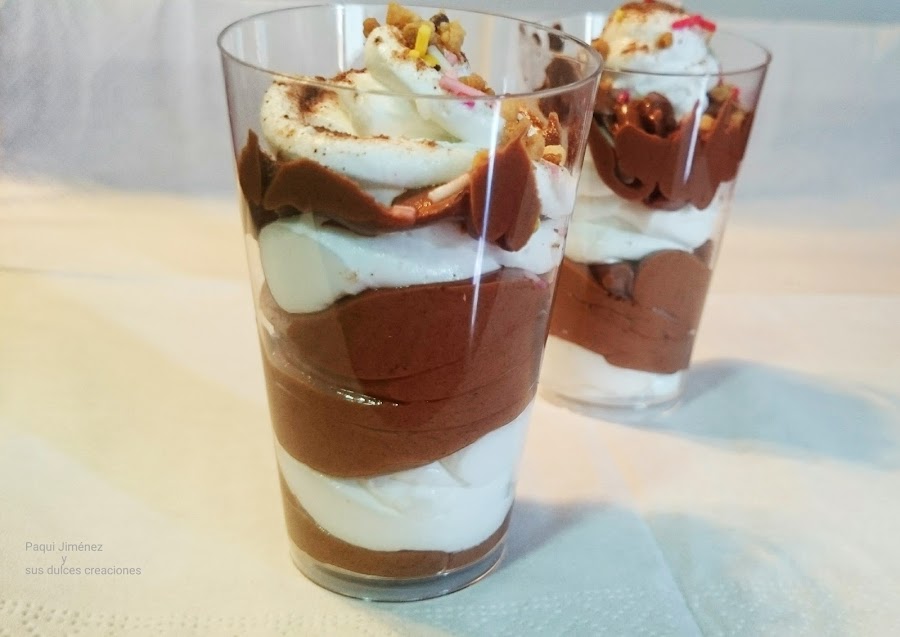 Coger los vasitos y poner capa de crema de chocolate y encima otra de nata (crema de leche), así hasta que llenéis los vasos.