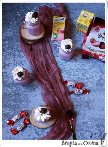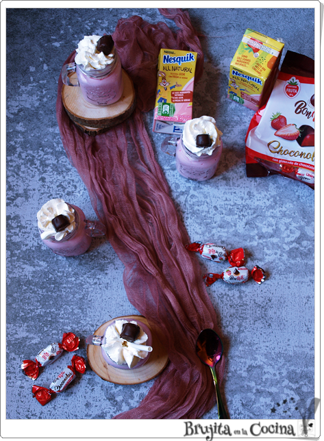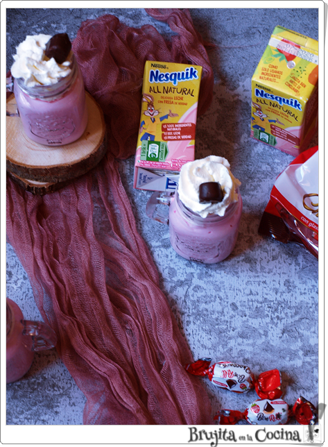 Bueno, pues al recordar esos batidos de fresa, que luego me ponían un buen copete de nata (crema de leche) ha sido la inspiración para estos postres y como toque final en lugar de una guinda, o fresa, nada mejor que una choconola de Bon Roll, una gominola de fresa recubierta de chocolate, con esto ya no se puede pedir más. Bueno sí, una cuchara y empezar a probarlo, te apuntas??