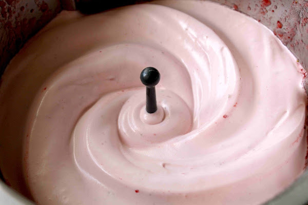 Con la batidora y puestas las varillas, montamos la clara, cuando está le añadimos poco a poco la mezcla de las fresas sin dejar de remover.