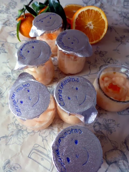 Proceso de sellado de los "yoguses"En un cazo ponemos los 200 ml de agua, el agua de azahar y el azúcar a calentar al fuego, cuando rompe el hervor añadimos el sobre de gelatina en polvo sabor naranja, removemos bien hasta que esté completamente disuelta. Fuera del fuego mezclamos con los 250 ml de agua fría. Vertemos en una bandeja honda y llevamos al frigorífico por una hora.