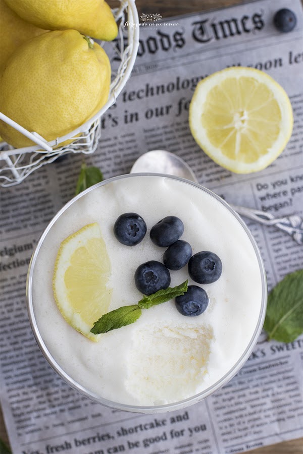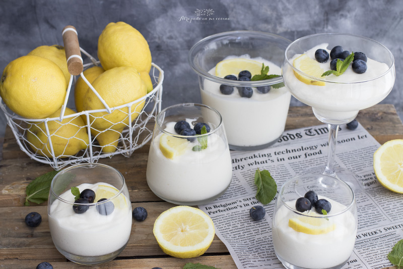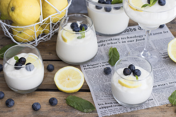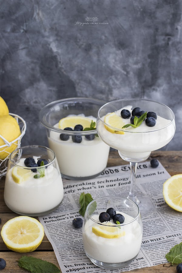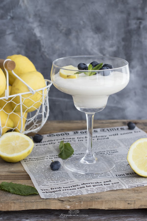 Hoy viernes os traigo el postre, un postre de los de limón de toda la vida, que para los amantes de los postres de limón, como yo, es una receta de diez. La receta la encontré como una receta chilena, aunque la verdad es que se trata de una riquísima mousse de limón. Ya hace mucho tiempo os dejaba la receta de la mousse de limón elaborada con leche evaporada, que se convirtió en una de las recetas más vista de este blog. Pues bien, en esta ocasión también lleva leche evaporada, y además leche condensada, por lo que este postre es más calórico que el anterior, pero realmente sale tan bueno, que merece la pena. En la receta original se acompañaba de bizcochos de soletillas, pero yo le he puestos unos arándanos y unas hojas de hierbabuena para hacerlo más ligero.
