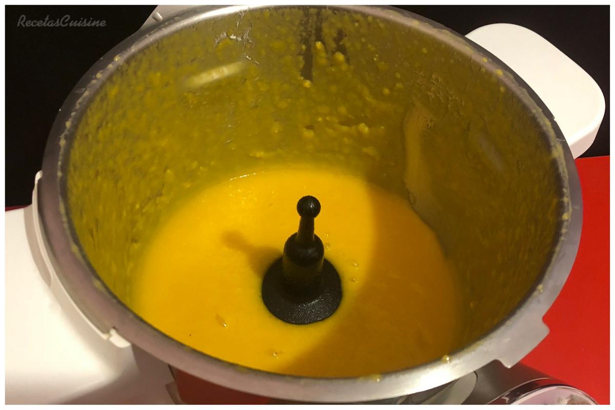 3. Damos un agua al bol y lo equipamos con la cuchilla ultrablade. Ponemos dentro el mango pelado y troceado, el azúcar y el zumo de lima. Programamos velocidad 12, con tapón, hasta obtener un puré fino.
