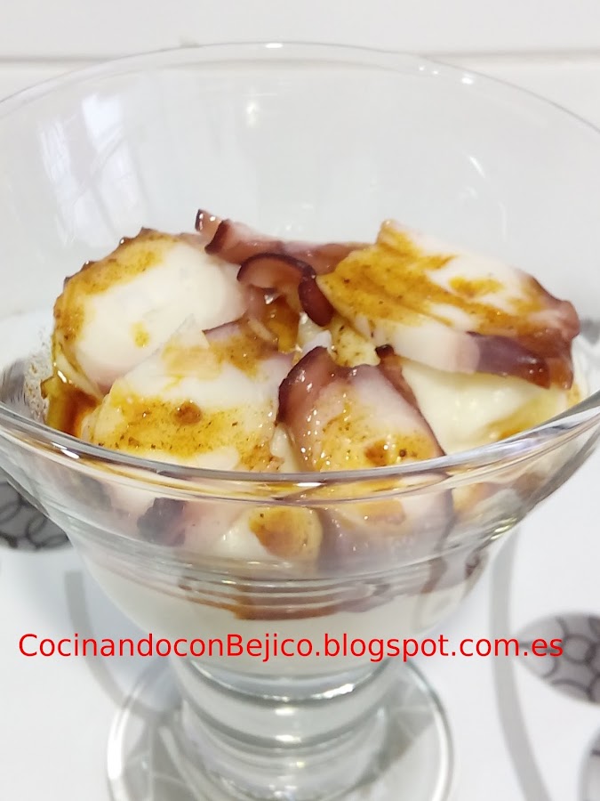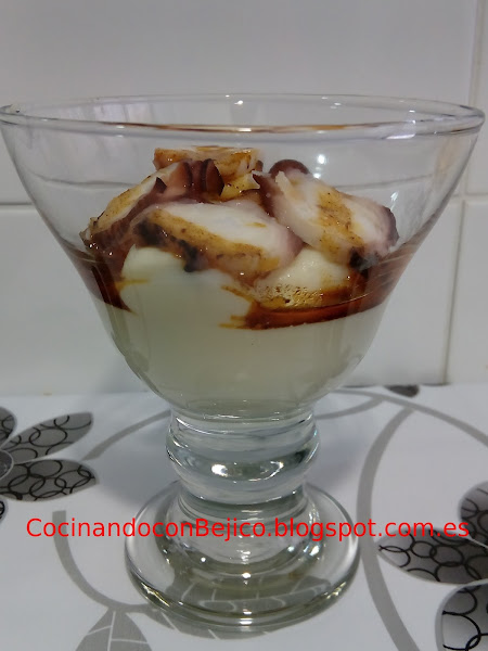 Servimos en copas un poco de espuma de patata, encima ponemos rodajas de pulpo cocido y tibio y decoramos con aceite de pimentón y sal en escamas.