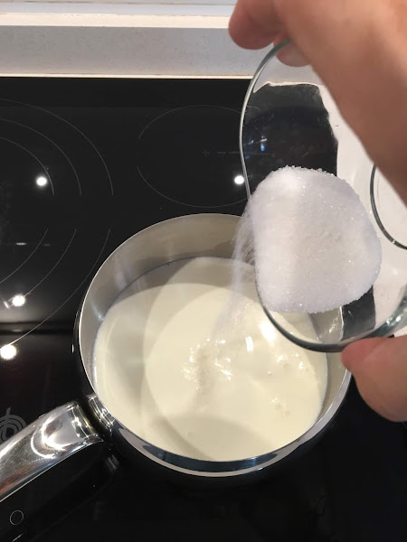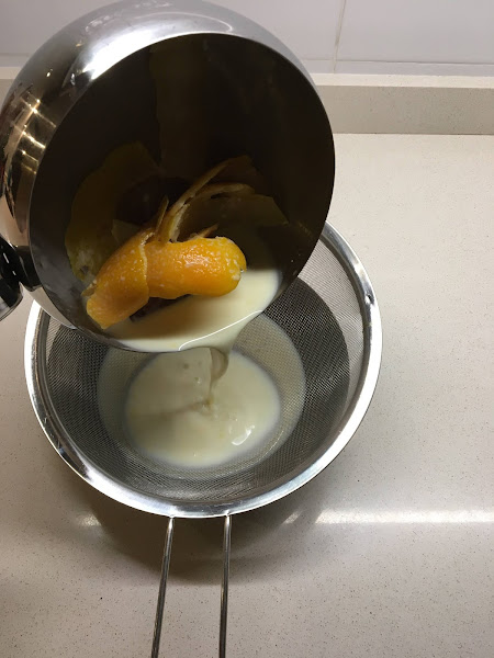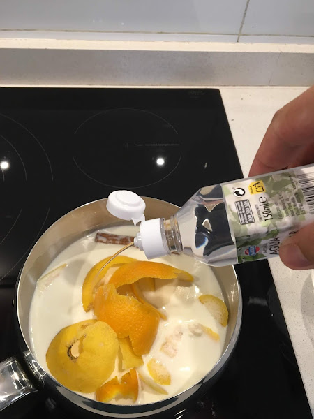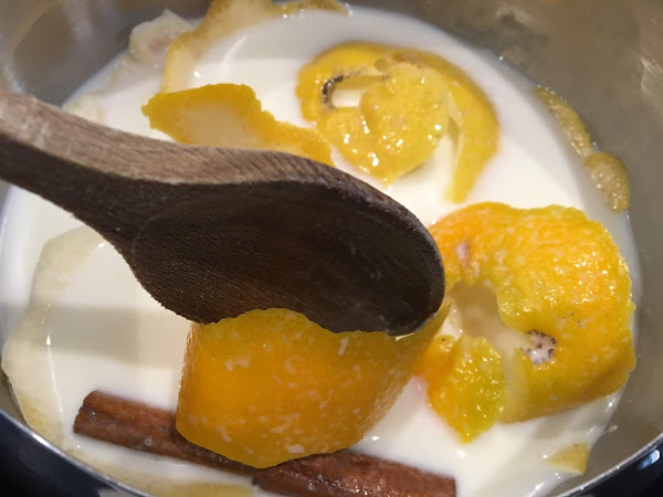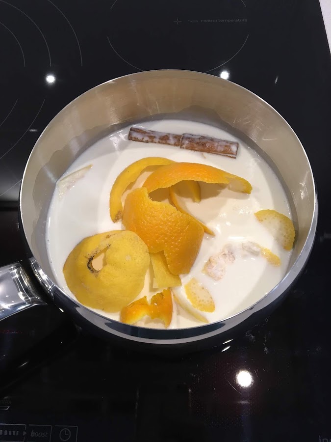 En una cazuela pequeña ponemos a calentar a fuego suave la leche, la nata (crema de leche), el azúcar, las pieles que limón y naranja que acabamos de pelar, una trozo de canela en rama y un chorro de aroma de azahar líquido.