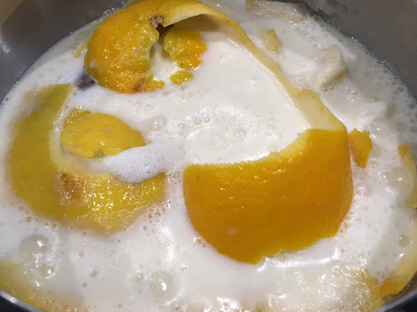 Cuando la mezcla hierve paramos el fuego y en la misma cazuela lo dejamos enfriar mientras las cáscaras se infusionan.