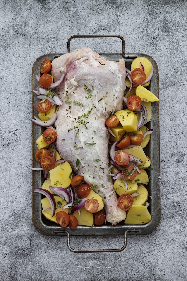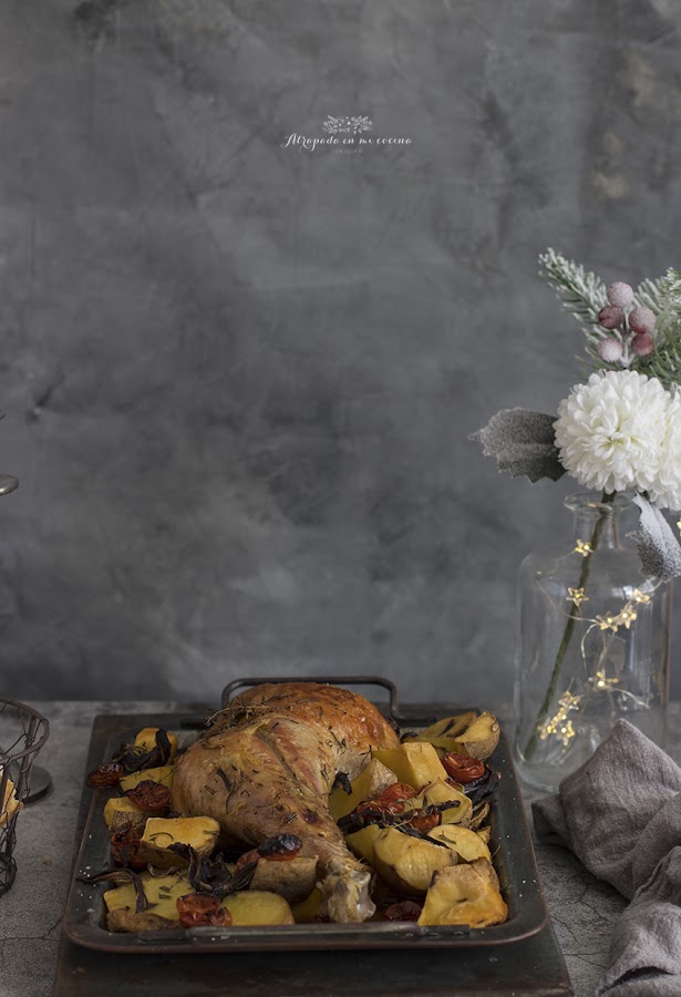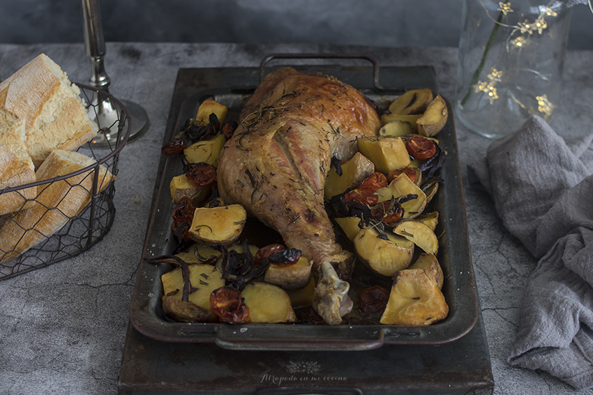 La cebolla y los tomates cherry podéis añadirlos más tarde, si no os gusta que queden un poco chamuscados. Por lo que de primeras podéis introducir sólo la pierna de pavo y las patatas y luego añadir los tomates y la cebolla.