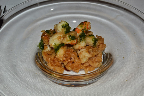 Un gajo de tomate ¿osmotizado?, cebolla tan cocinada que casi parecía mermelada, puré de tupinambo y hoja de albahaca frita. El dulce de la cebolla y del tubérculo aporta cremosidad y acompaña perfecto al marisco.