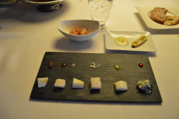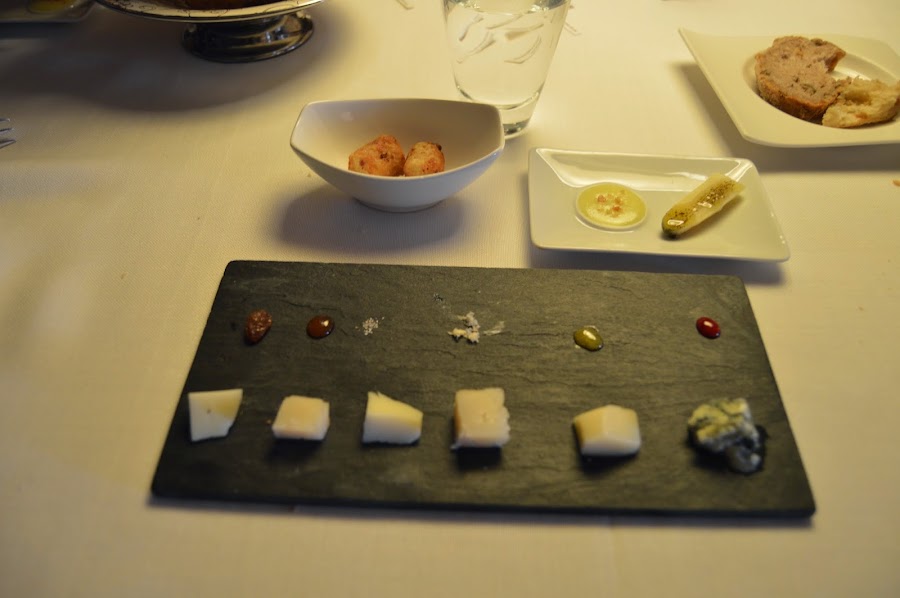 Aperitivo: Tabla de quesos catalanes, cada uno con un ingrediente de maridaje. No nos explicaron cual era cual lo cual hubiera molado, pero eran muy diferentes, de suave o fuerte.