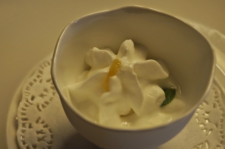 Los postres ácidos me suelen gustar. Este en particular era muy ligero y suave, una espuma con algo de menta y un lemon curd en la base. Más sabor a cítrico que a yogur pero bueno y refrescante.