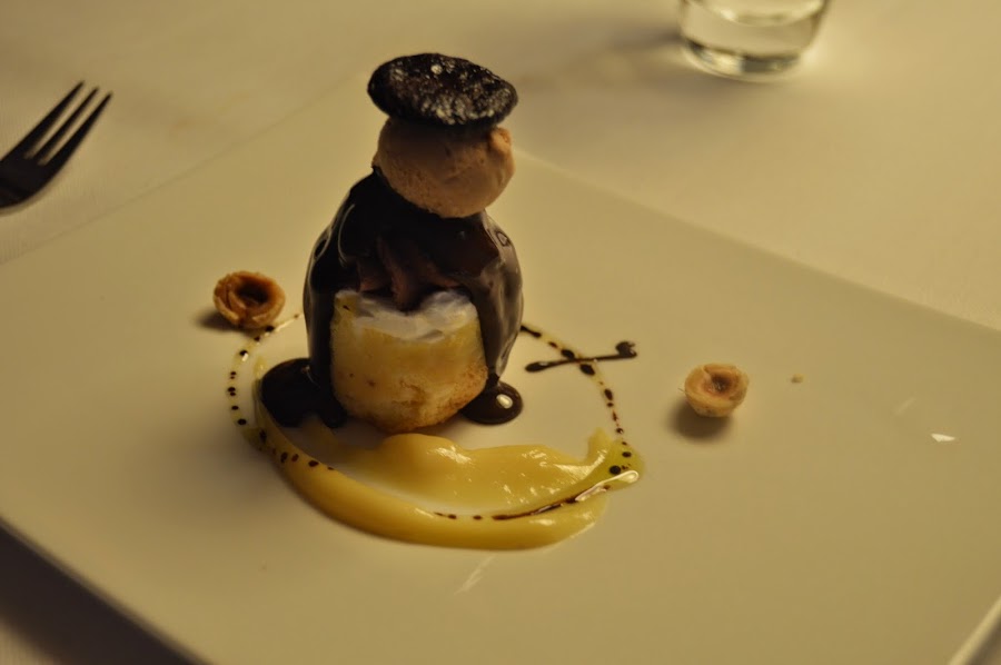 Pastel "Claudio" Aunque el aspecto al principio no me gustó, el postre en su total estaba muy bueno, creo recordar que era helado de turrón con teja de cacao, bizcocho neutro (algo seco, suerte de la salsa de chocolate) y crema pastelera, ingredientes sencillos y bien combinados.