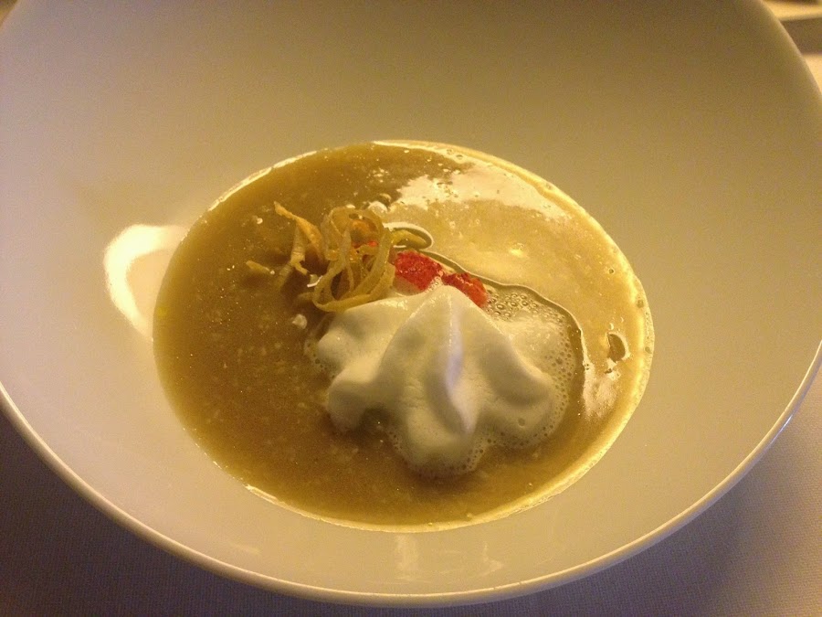 Un caldo con sabor increíble, más parecido a una sopa de cebolla que a una Vichyssoise, el coco en forma de espuma con el puerro gran combinación, pero el bogavante quedaba algo tapado, repetiría mil veces.