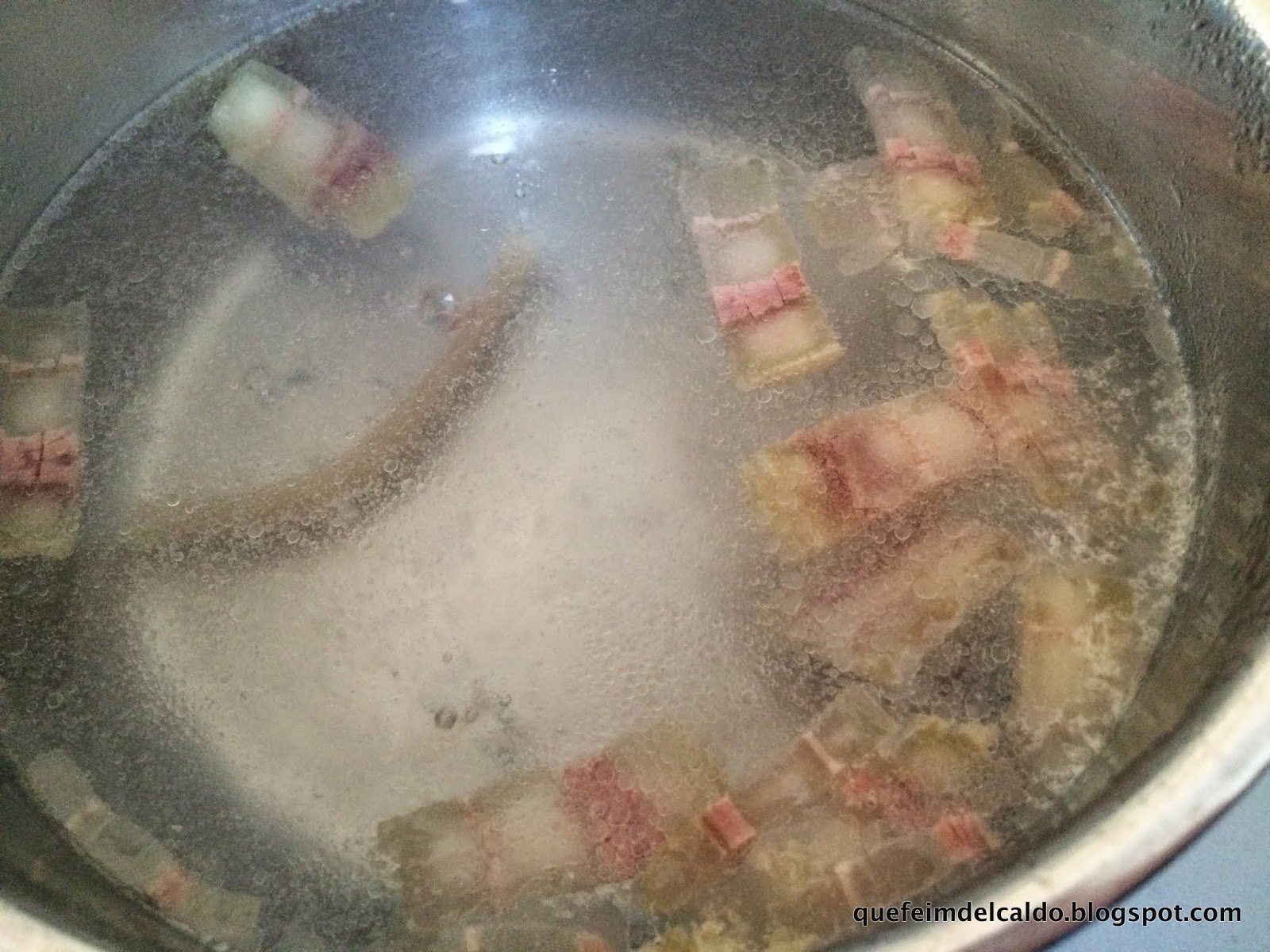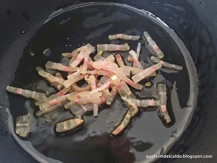 En un cazo con agua caliente ponemos a escaldar el tocino durante 10 minutos.