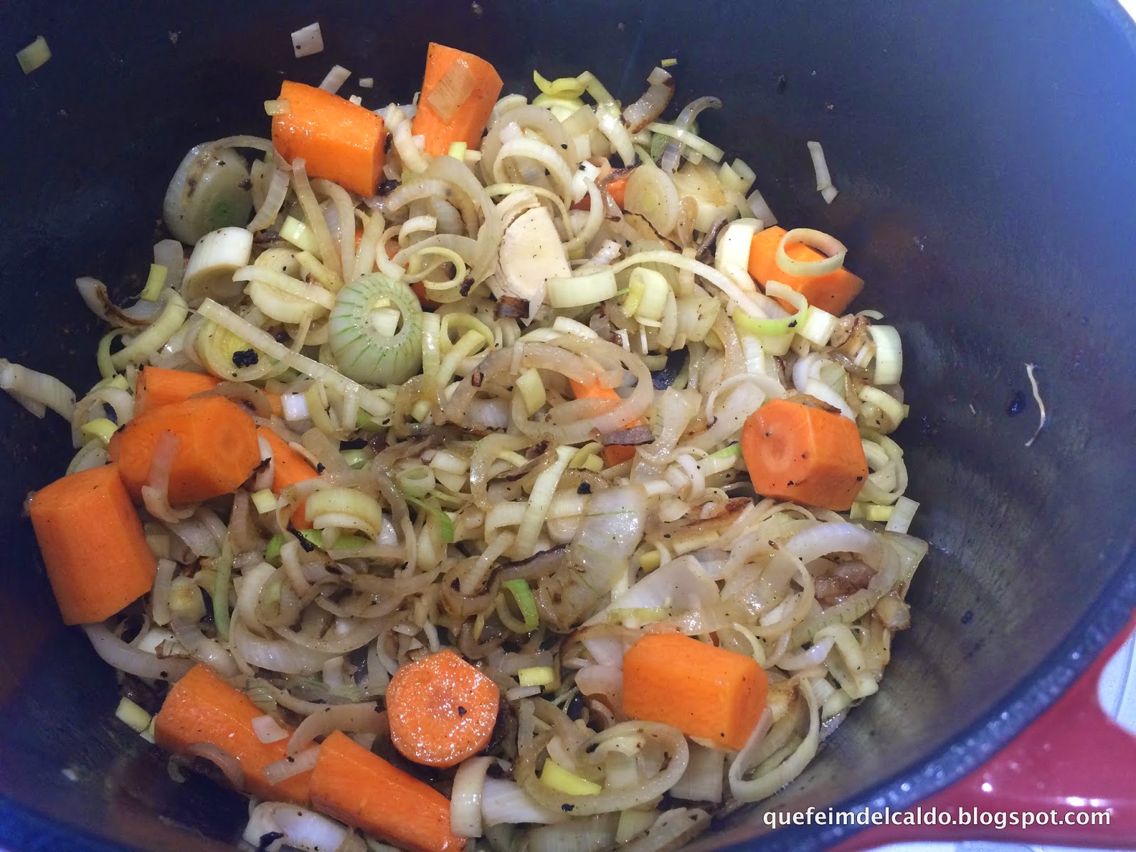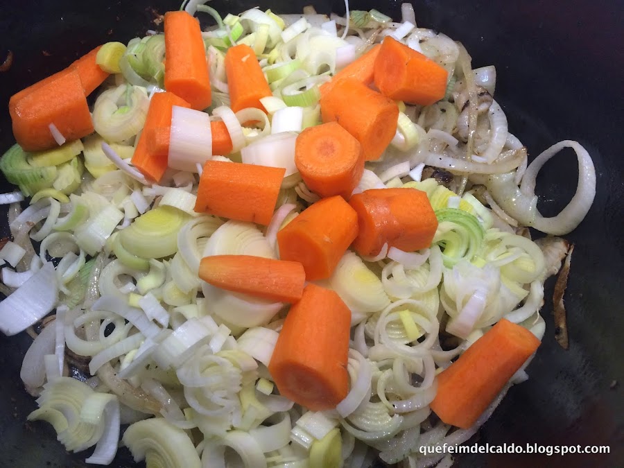 Cortamos el puerro, la cebolla tierna y la zanahoria, lo añadimos en la cazuela sin poner nada más de grasa.