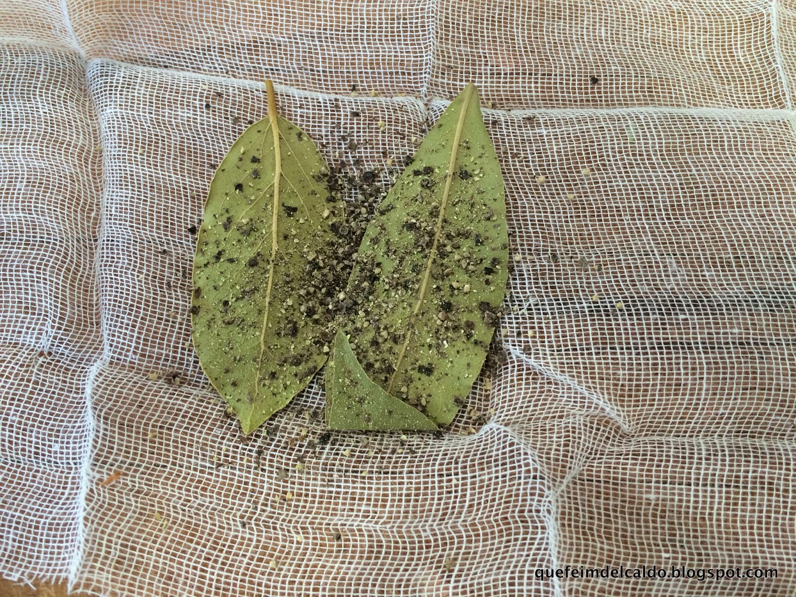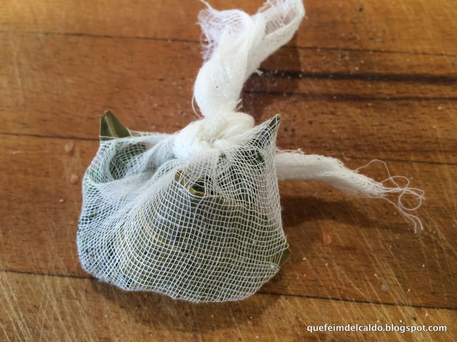 Hacemos un atillo de hierbas aromáticas, lo hacemos con una gasa, dos hojas de laurel, pimienta, perejil y tomillo.