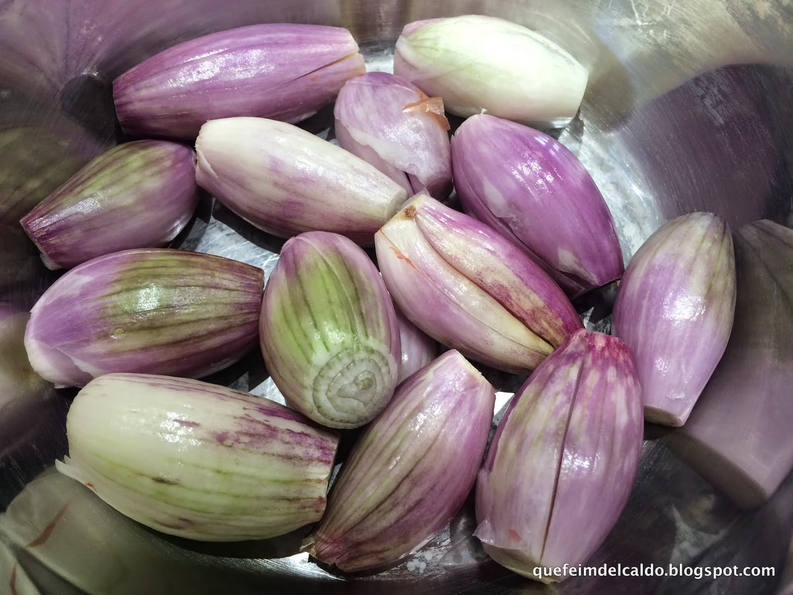 Pelamos las chalotas y las introducimos en un cazo.