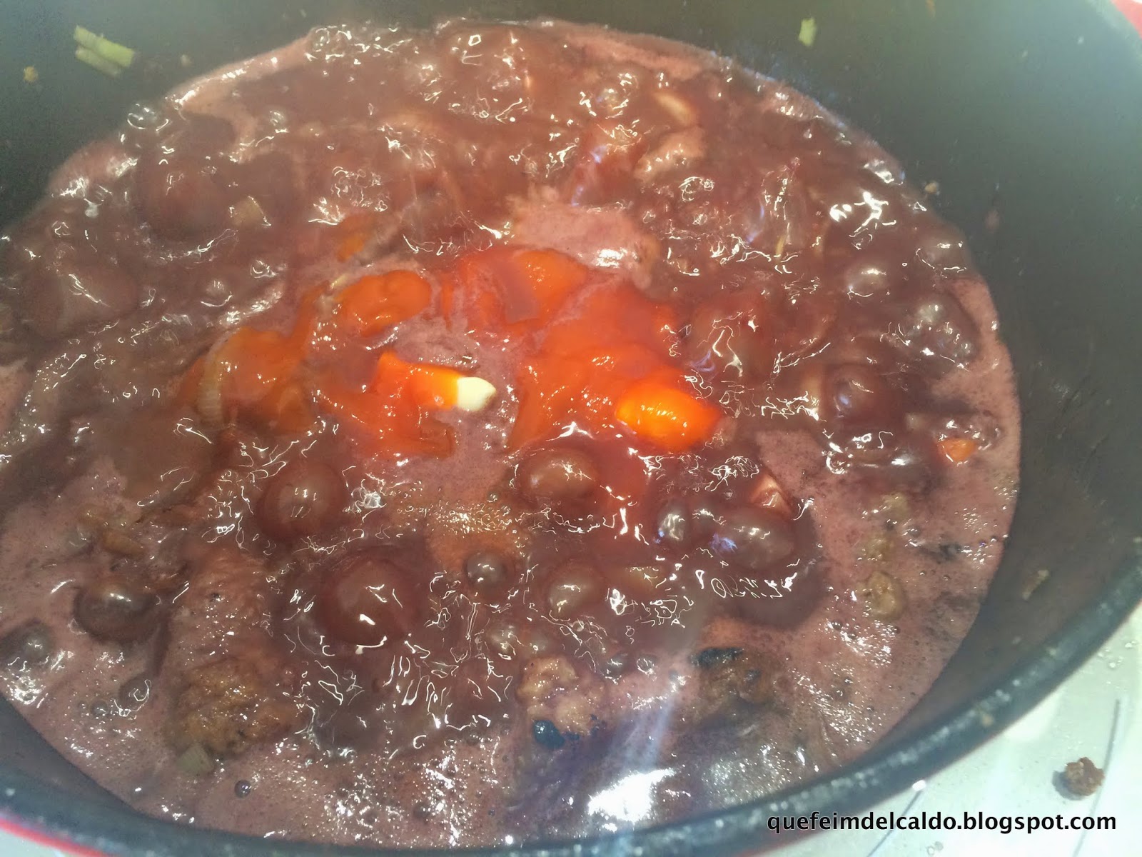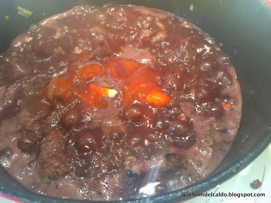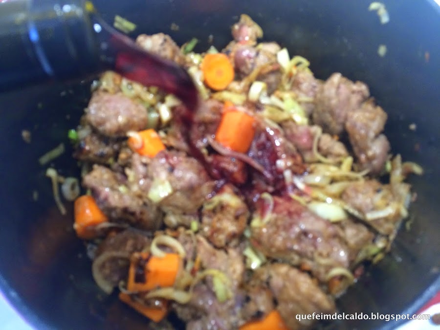 Incorporamos el vino tinto hasta cubrir la carne con el vino.