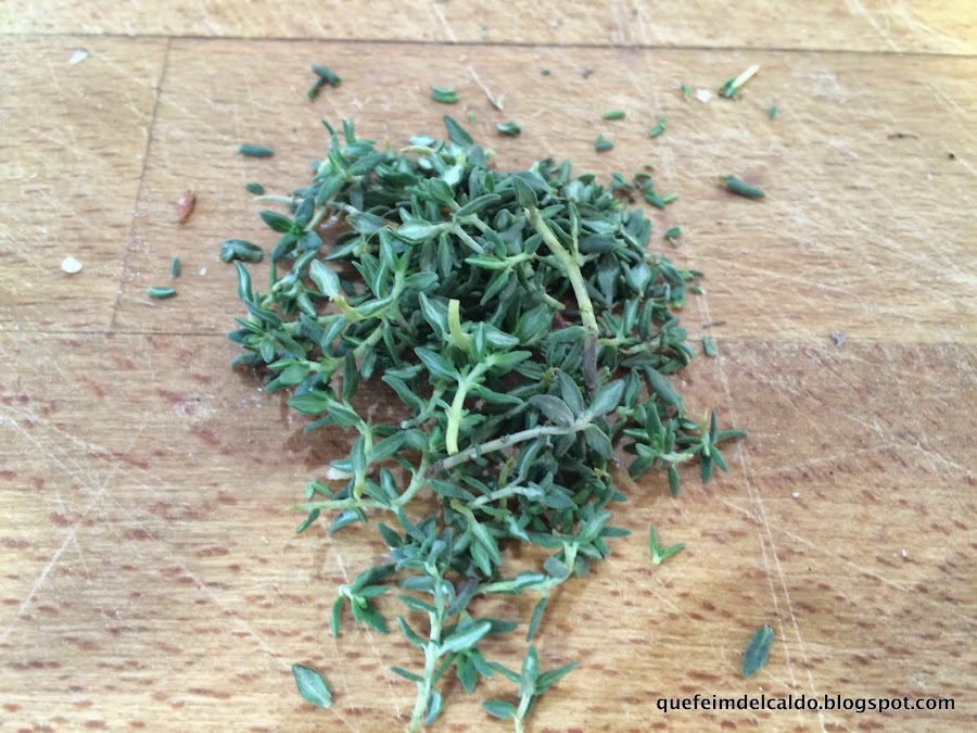Añadimos por último a la cazuela 2 hojas de laurel y las hojitas de tomillo.
