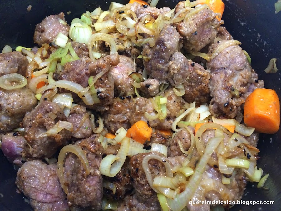 Una vez dorada la carne de buey retiramos de la cazuela y reservamos en una plato aparte.